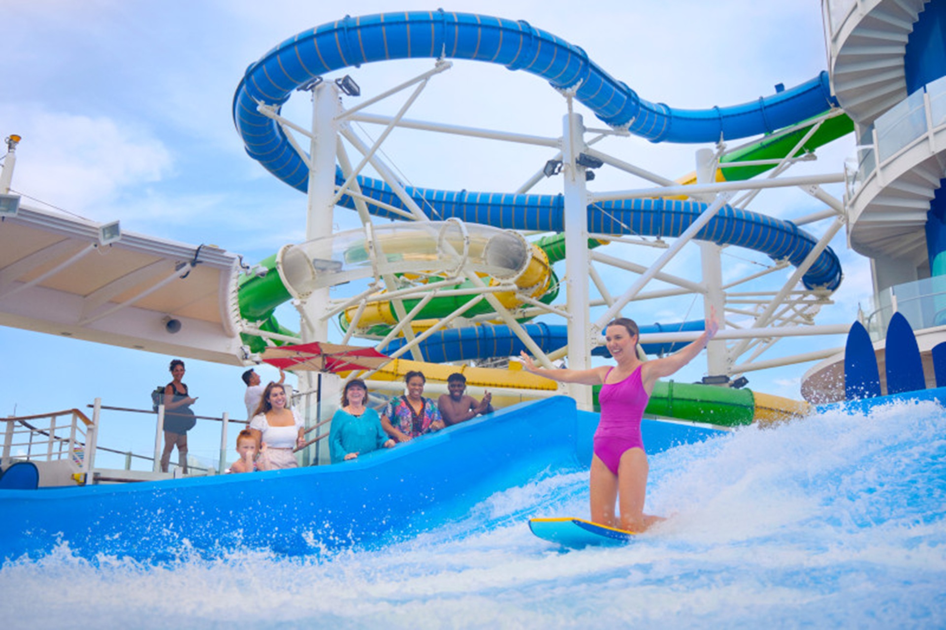 Splashaway Bay is a new waterpark on board for kids only while the solarium is an adult only pool space with retractable glass roof and cantilevered whirlpools. The main pool area features a movie screen for alternative evening entertainment from the theatre, casino and nightclub. Of particular note is the Studio B Ice Rink for ice skating spectaculars and it also converts into a large entertainment space for dancing and laser tag. Try out the Flowrider surfing simulator or perhaps have a putt in the dunes putting course.